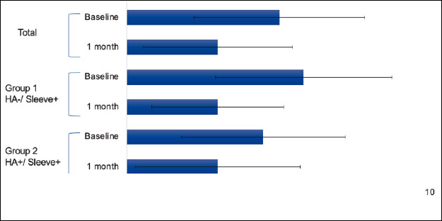 At one month, both groups demonstrated improvement in knee health, pain, and satisfaction. KOOS JR scores improved by 12.27 points in the HA-/Sleeve+ group and 9.809 points in the HA+/Sleeve+ group. Pain scores decreased by 3 points and 2 points, respectively. Satisfaction scores increased by 1.416 points in the HA-/Sleeve+ group and 0.278 points in the HA+/Sleeve+ group. Improvements were greater in the HA-/Sleeve+ group across all measures.
