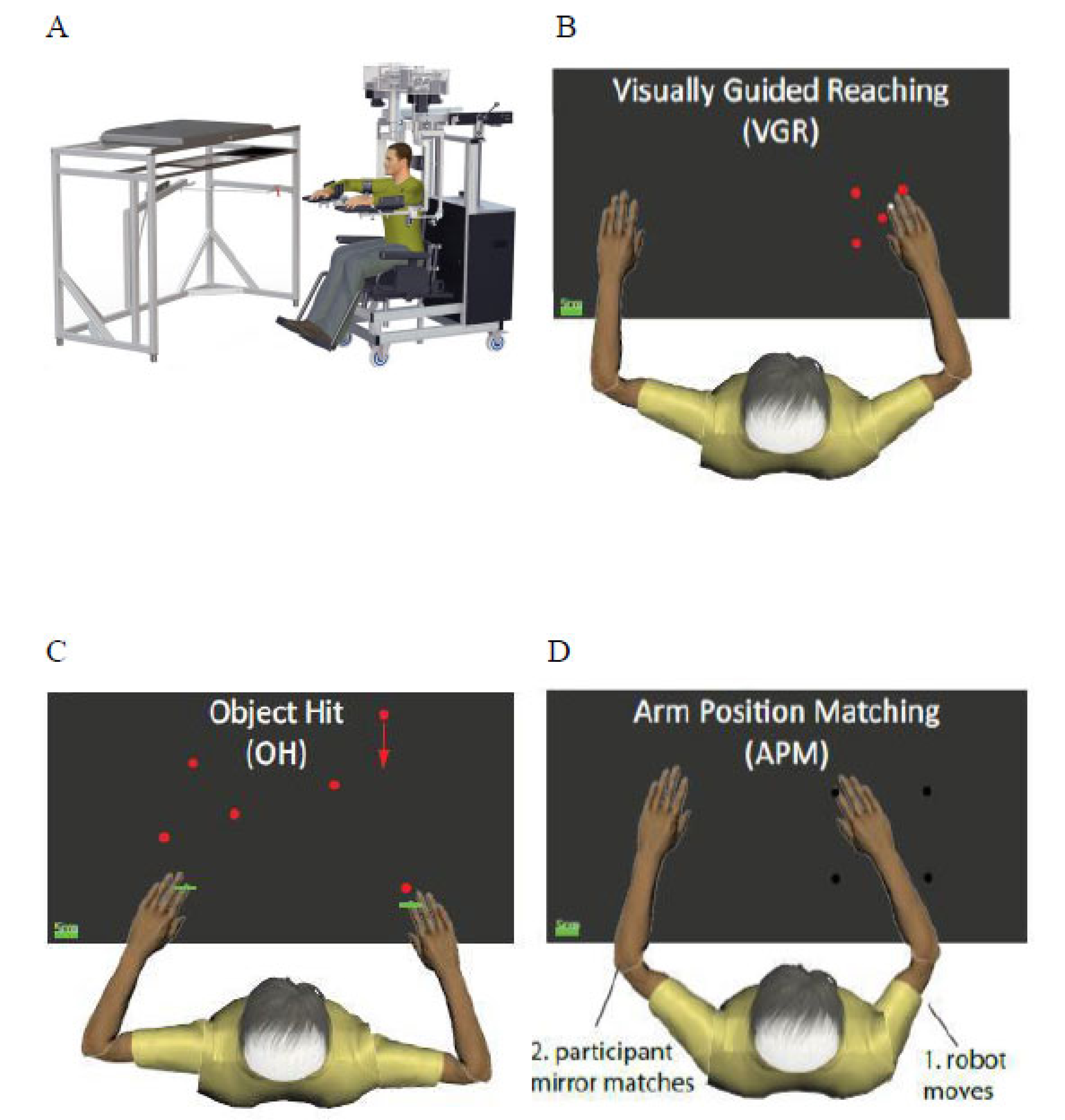 Kinarm robotic system and task paradigms used for objective assessment of upper limb function. (A) Overhead view of participant seated in the Kinarm Exoskeleton Lab. (B) Visually Guided Reaching (VGR): Participants reach from a central target to peripheral targets using real-time visual feedback. (C) Object Hit (OH): Participants use virtual paddles to strike moving balls appearing at increasing frequency and speed across the screen. (D) Arm Position Matching (APM): The robot moves one arm to a position, and the participant mirrors the movement with the opposite arm.