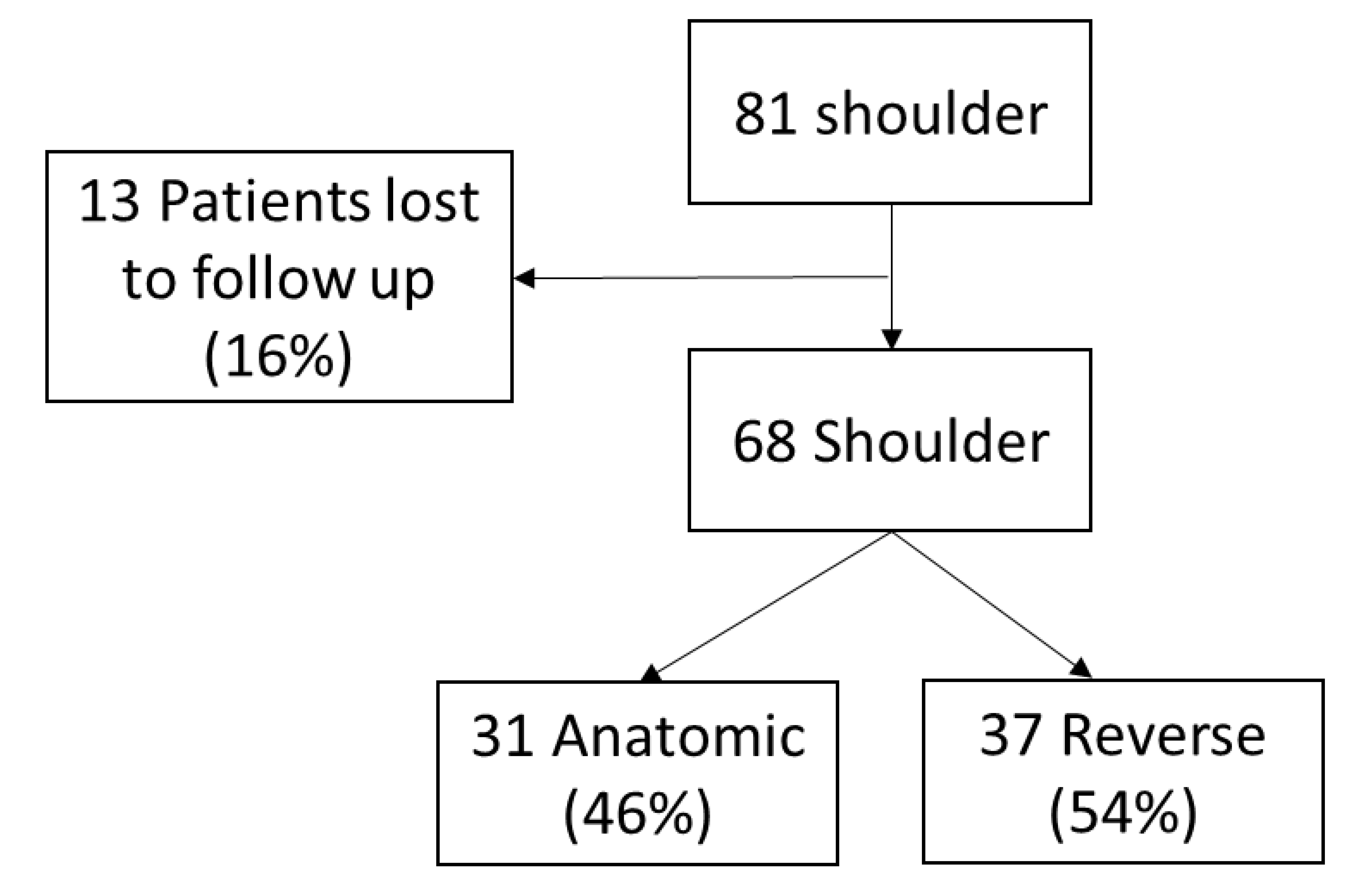 Flowchart of patient enrollment and group allocation. A total of 81 shoulders were enrolled in the study. 13 shoulders (16%) were lost to follow-up, leaving 68 shoulders for analysis. Of these, 31 received an anatomic Total Shoulder Arthroplasty (TSA; 46%) and 37 received a Reverse Total Shoulder Arthroplasty (RSA; 54%).