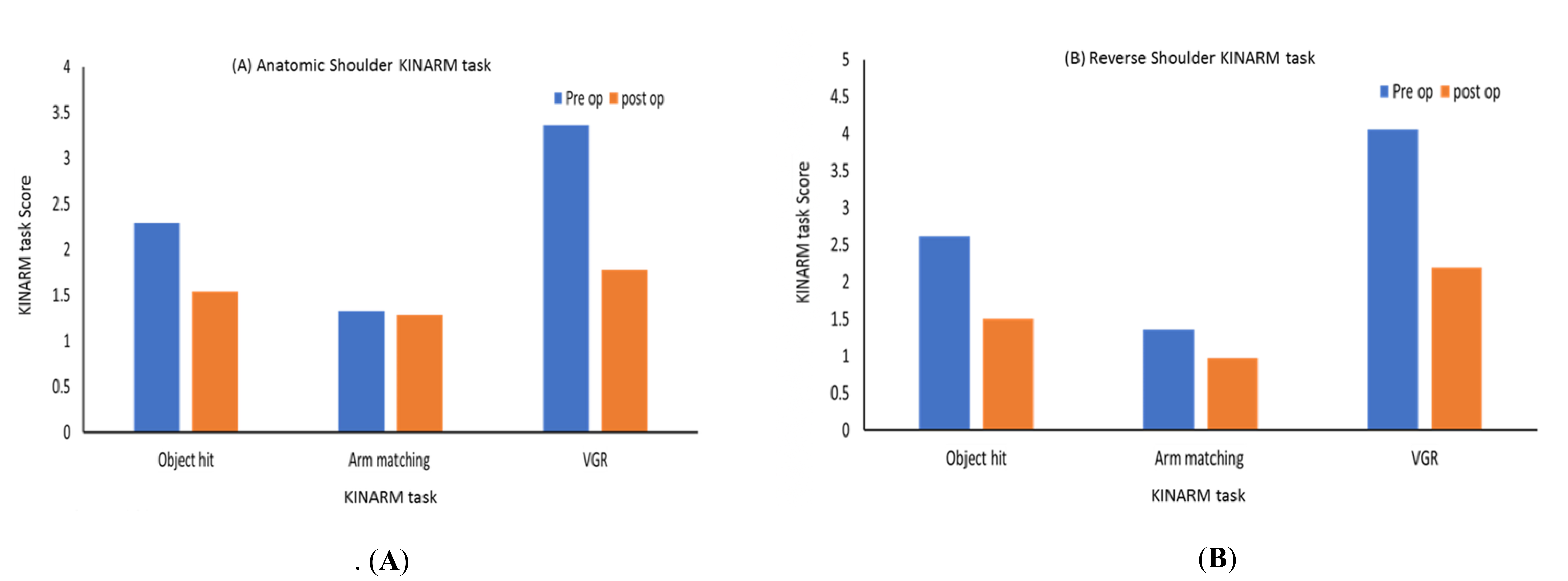 Pre- and post-operative Kinarm task performance in patients undergoing shoulder arthroplasty. (A) Anatomic Total Shoulder Arthroplasty (TSA) group and (B) Reverse Shoulder Arthroplasty (RSA) group performance on three KINARM tasks: Object Hit (OH), Arm Position Matching (APM), and Visually Guided Reaching (VGR). Task Scores decreased post-operatively in both groups, indicating improved motor and sensory function. RSA patients demonstrated greater improvement in Arm Position Matching compared to TSA. Bars represent mean Task Scores. X-axis: KINARM task (Object Hit, Arm Position Matching, VGR). Y-axis: KINARM Task Score (z-score; lower = better, 0 = control mean, 1.96 = 95th percentile).