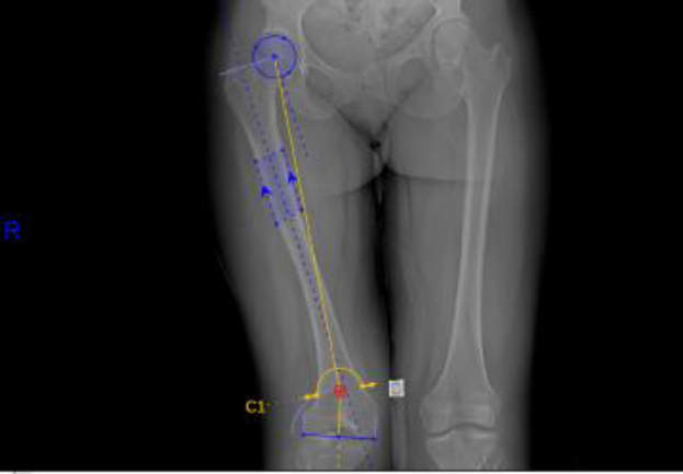 Preoperative hip-to-ankle standing radiograph with templated dome osteotomy for correction of a femoral deformity (patient #14).