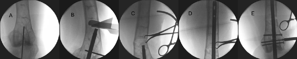 A) Based on preoperative templating, the retrograde starting point is obtained. B) After reaming the entry point to a diameter 1mm larger than the nail diameter, a tubular reduction device is advanced to the apex of the deformity. Osteotomy triangles are used to align the sagittal saw to cut the desired-sized wedge. Circumferential protection of the surrounding soft tissues is achieved with thin, malleable retractors contoured for the specific anatomic site. C) After removal of the wedge, the reduction is obtained and compressed with a pointed reduction clamp placed through unicortical drill holes above and below the osteotomy site. D) The intramedullary nail is advanced across the compressed osteotomy site. E) The intramedullary nail is locked above and below the osteotomy site.
