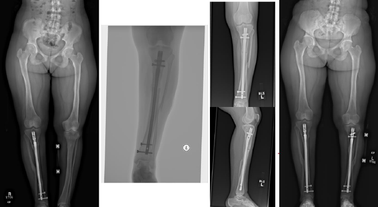 | 15 | 32 | M | Osteogenesis imperfecta, Klippel-Trénaunay syndrome | Tibial osteotomy | Right tibial valgus | Hardware removal |