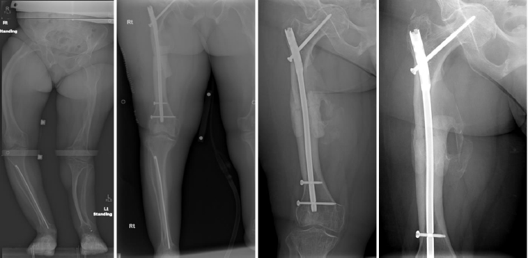 | 4 | 11 | F | Right proximal femoral cyst | Three prior operations, including excision, bone grafting, hip screw, and sideplating | Right femoral varus | - |