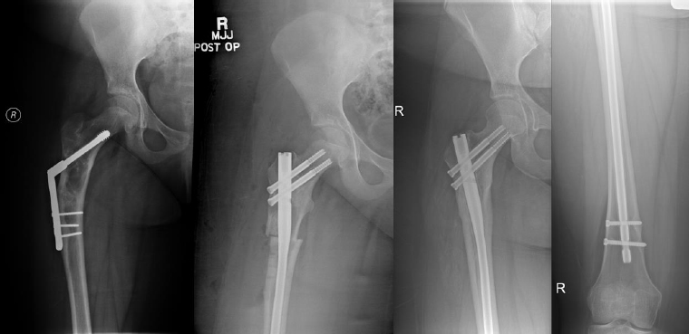 | 18 | 62 | M | Osteogenesis imperfecta | Intramedullary femoral nail | Left femoral valgus | Nonunion requiring open reduction and internal fixation with iliac crest bone grafting |